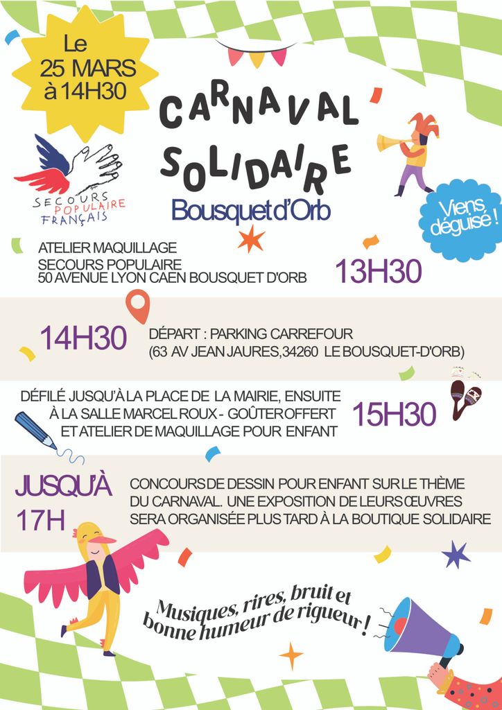 Le Secours populaire du Bousquet d’Orb organise un carnaval le 25 mars à partir de 13h30 un atelier maquillage à la boutique solidaire et invite tous les enfants à y participer, déguisement et ou masques fortement souhaités !