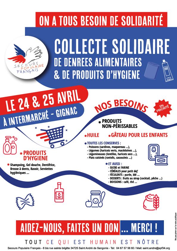 Le comité de Saint André de Sangonis organise une collecte solidaire de denrées alimentaires et de produits d’hygiène.