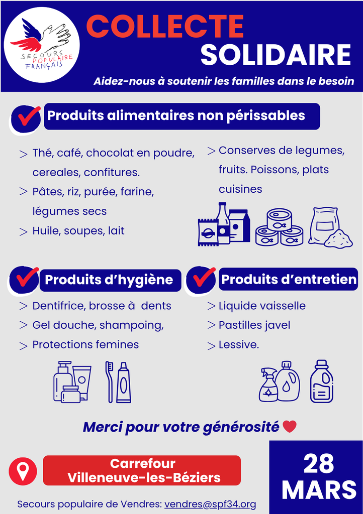 Le Secours populaire français organise une collecte solidaire au Carrefour de Villeneuve-lès-Béziers ! Venez nous soutenir en déposant des produits dont nos familles ont grand besoin