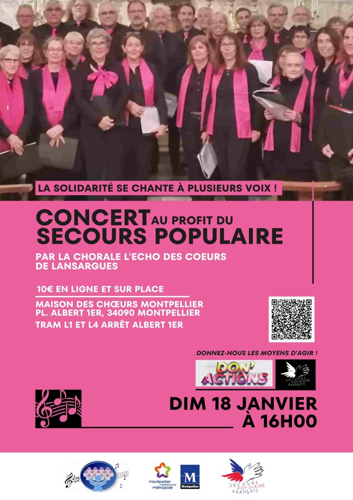 Rendez-vous le dimanche 18 janvier à 16h à la Maison des chœurs pour un concert solidaire en partenariat avec le Secours Populaire de L’Hérault et la chorale L’Echo des cœurs de Lansargues.