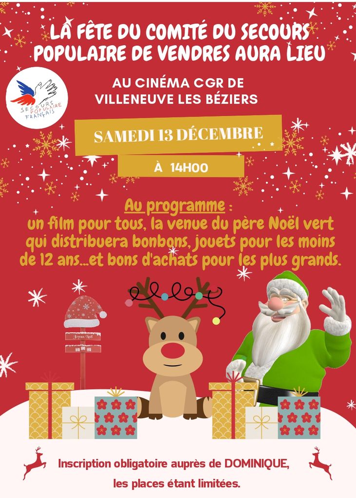 Fête de Noël avec projection d’un film pour tous, visite du père Noël vert qui distribuera des bonbons et jouets pour les enfants de moins de 12 ans, ainsi que des bons d’achats pour les plus grands.