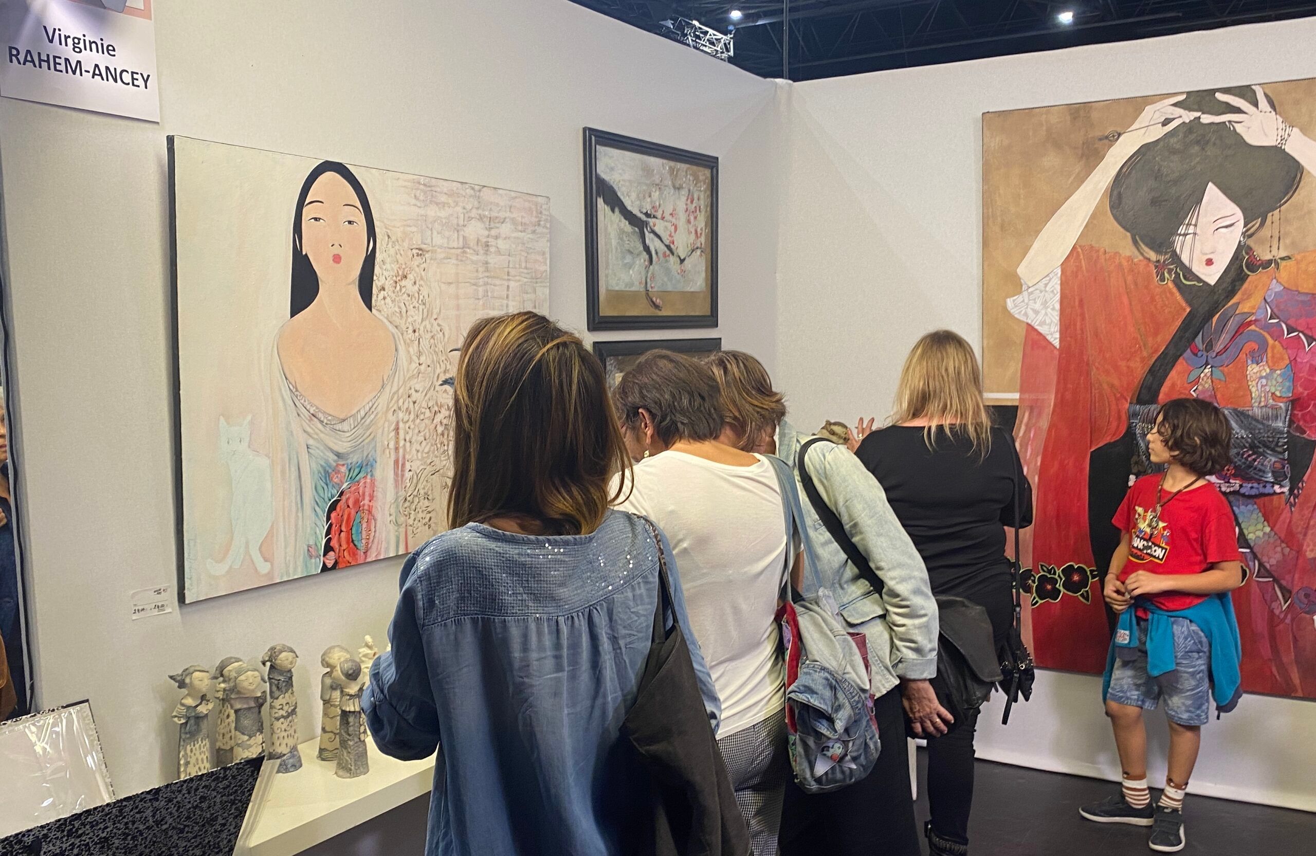 Je travaille à partir de mes lectures, et ce que j’expose ici est issu de la lecture des mémoires d’une geisha. J’ai fait une centaine de toiles différentes, dans différents matériaux (acrylique et peinture à l’huile). Je pratique plusieurs formes artistiques : peinture, sculpture, grès, porcelaine pour lesquelles je me livre toujours à un certain apprentissage.