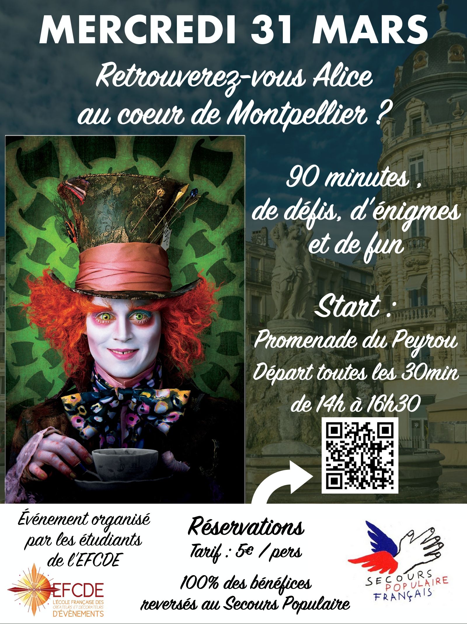 - Le Mercredi 31 Mars 2021 : Durant une après-midi, une petite aventure à Montpellier mêlant découverte du cœur de la ville, énigmes et défis à réaliser en équipe sur le thème de Alice aux Pays des Merveilles. Chaque équipe, composé de 5 personnes, aura de 90min pour retrouver Alice dans Montpellier. Le but est de récolter des indices sur sa localisation tout au long du parcours. À la fin du parcours, chaque équipe recevra des petits cadeaux. Le tarif de cette animation est fixé à 5€ / personne. 25 pers max pourront participer à cette aventure afin de respecter des jauges en accord avec les conditions sanitaires actuelles.