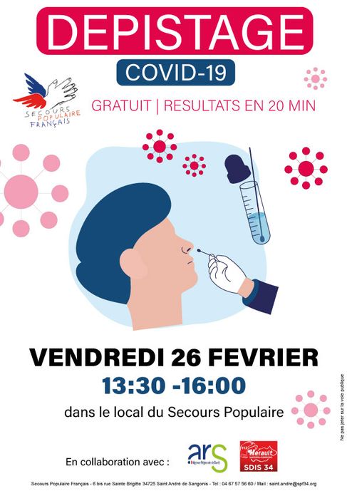 Vendredi 26 février, des tests antigéniques sont proposés aux familles accueillies du comité Spf de Saint André de Sangonis. Ce dépistage du COVID à lieu pendant le libre service de l'alimentation solidaire de 13h30 à 16h. Les tests sont effectués par les pompiers du SDIS 34 en collaboration avec l'ARS.