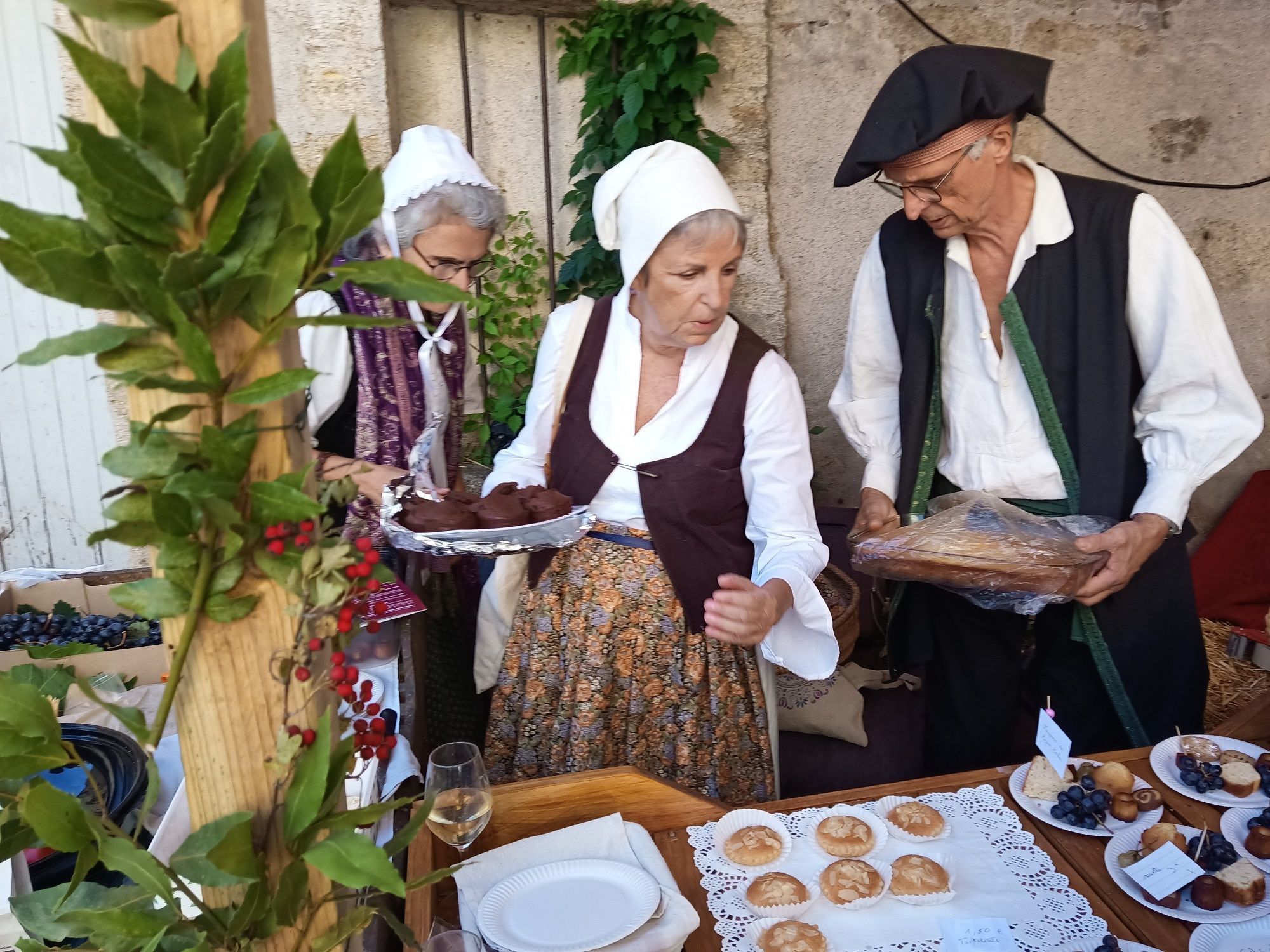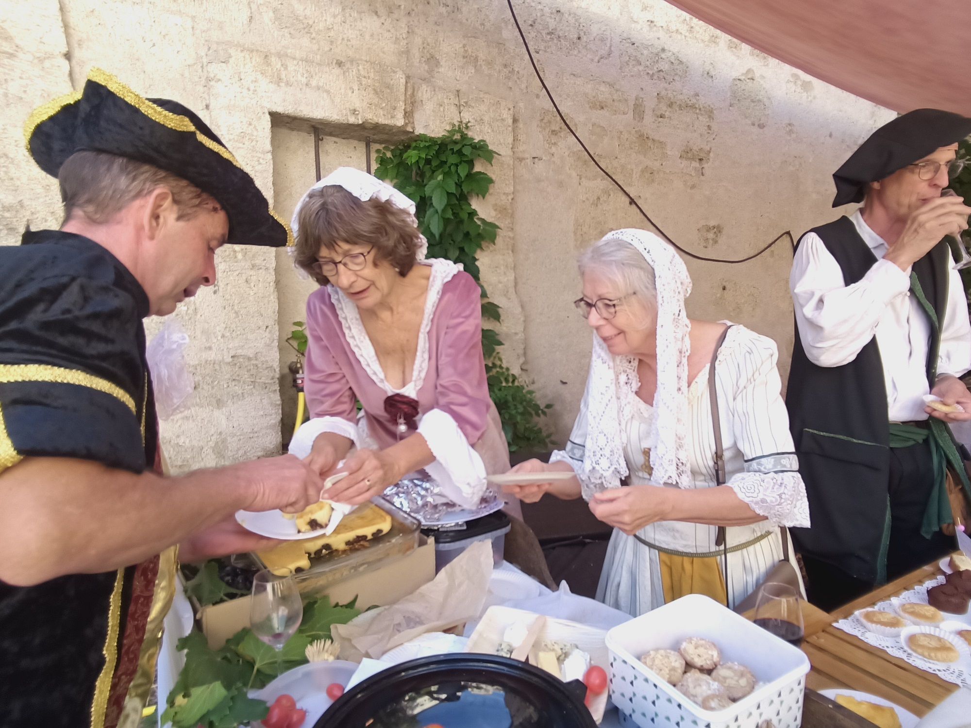 Nous avons fait des costumes, nous en avons également empruntés et une douzaine de bénévoles se sont succédé pour tenir notre petit stand d’époque fait par notre ami Richard. Marie-Françoise a réalisé des petits gâteaux à l’ amande à partir d’une recette d’un célèbre pâtissier-traiteur François Vatel, Philippe à réalisé des confitures maison et bien d’autres initiatives pour proposer des petits gâteaux et fruits de saison (figues et raisin) .