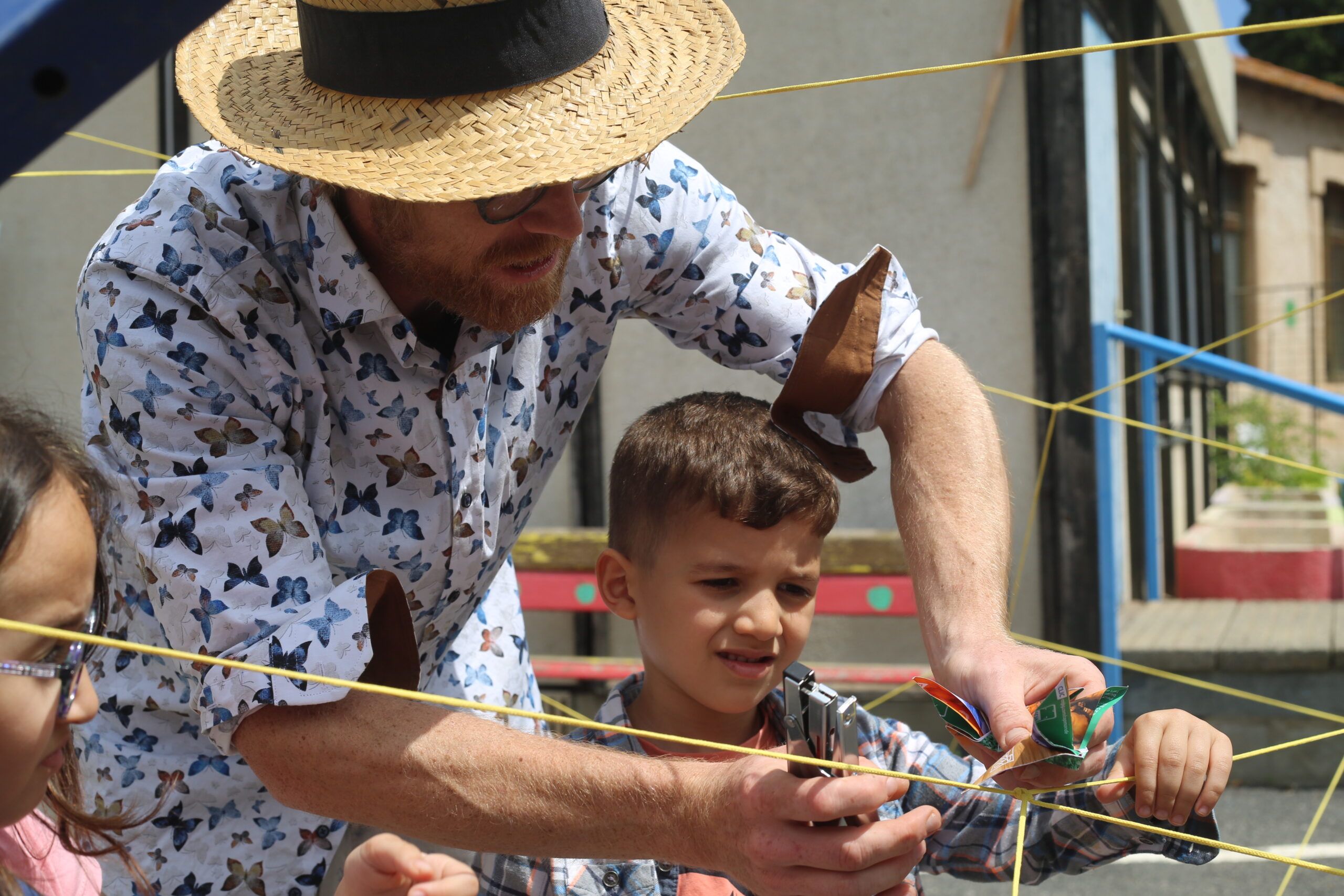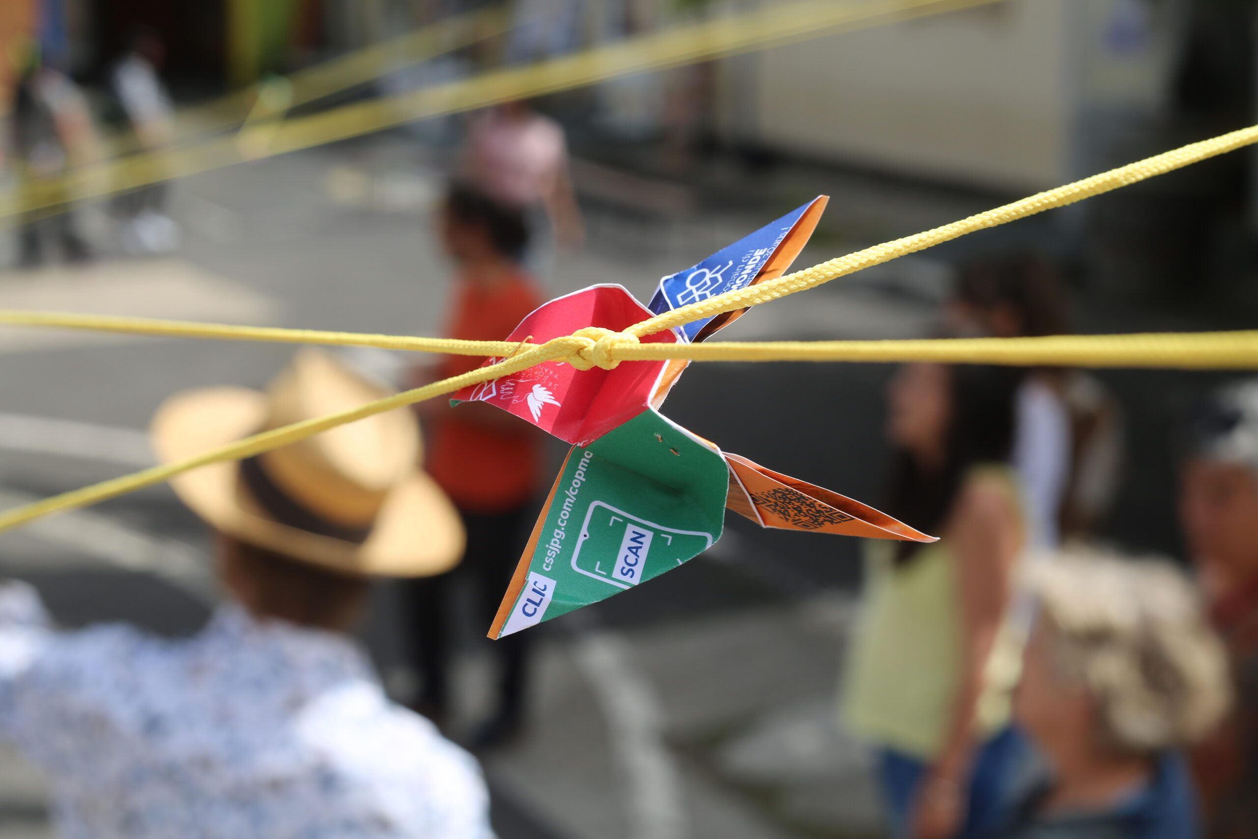 A la fin de la journée, les enfants sont repartis chez eux avec un origami qu’ils ont fabriqué eux-mêmes. Sur la structure, tout le monde a trouvé un nœud sur la corde, pour y accrocher son papillon. L’ensemble des productions flotte dans les airs, « ils sont connectés les uns aux autres », souligne l’artiste. – « Le mien est juste à côté du tien ! ». Tout le monde sait exactement où est accroché son papillon mais entre-temps l’œuvre est déjà devenue collective !