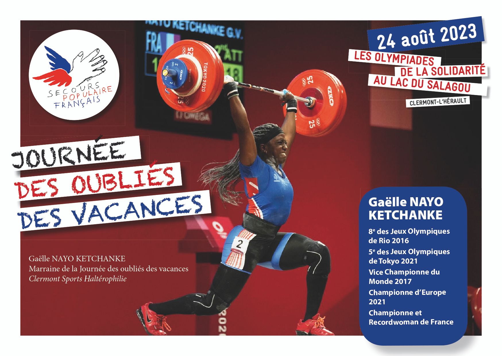 La fédération de l’Hérault du Secours populaire français organise pour 600 personnes la Journée des oubliés des vacances sur le thème des « Olympiades de la solidarité » le 24 août au lac du Salagou. La marraine de l'événement n'est autre que la championne Gaëlle Nayo-Ketchanke.