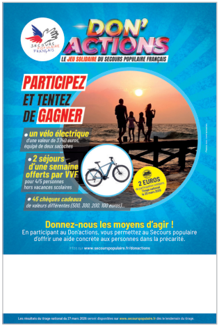 Le principe est simple : en achetant des tickets-dons à 2 euros, vous soutenez le Secours populaire tout en participant à un jeu solidaire avec de nombreux lots à gagner, dont un vélo électrique d’une valeur de 3 740 euros et des séjours en village vacances.