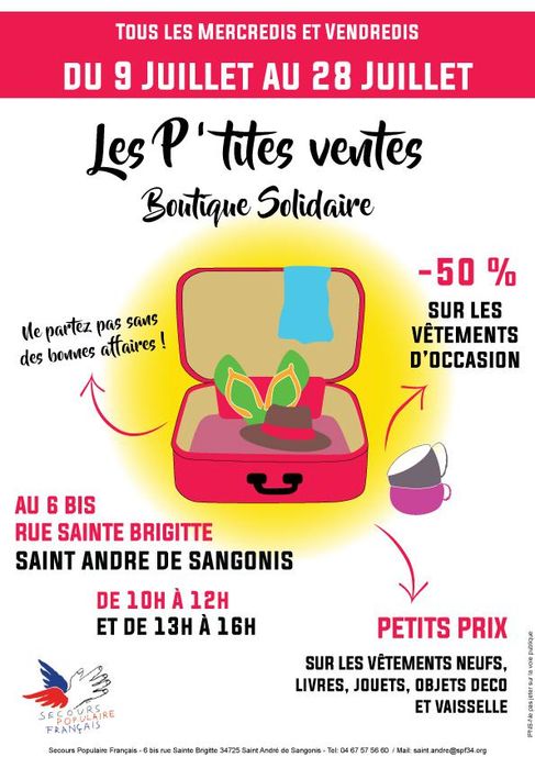 Pour un bon plan shopping, 100 % solidaire ! Rendez-vous au Secours Populaire de Saint André de Sangonis. Ouvert à tous, venez nombreux !