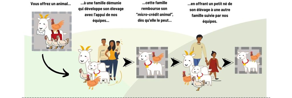 Le principe « Qui reçoit…donne » est en quelque sorte un « micro-crédit en animaux ». Vous offrez un ou plusieurs animaux à une famille qui pourra ainsi développer son élevage avec l’appui de l’association. Cette famille rembourse son « micro-crédit animal » aussitôt qu’elle le peut en offrant un ou des petits nés de son élevage à une autre famille. C’est ainsi une chaîne de solidarité à long terme qui se met en place.