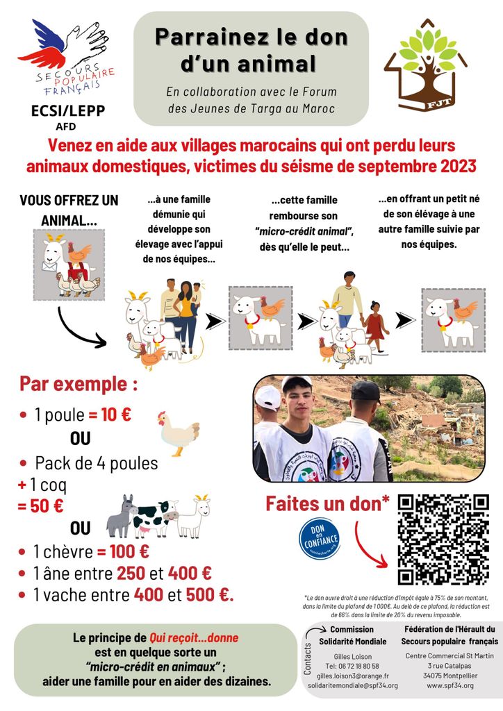 Cet appel fait suite à une mission au Maroc de la Commission Solidarité mondiale du Secours populaire de l’Hérault au mois de mai, auprès de notre partenaire local l’association « Forum des jeunes de Targa » (FJT), situé à Agadir. Cette association est dirigée, par Mohamed Oudra. Elle intervient en partenariat avec le Secours populaire national pour venir en aide aux populations victimes du séisme survenu le 8 septembre 2023. Elle a en charge 25 villages. La nature de son engagement pour l’aide alimentaire et pour la reconstruction, tout à fait en accord avec les valeurs du Secours populaire, mérite notre confiance et surtout notre soutien.