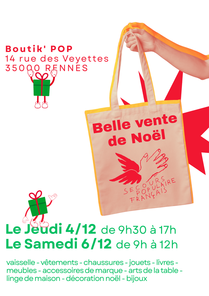 Comme chaque année, le Secours populaire français organise sa Belle vente de Noël : un rendez-vous solidaire pour préparer vos cadeaux et faire de belles trouvailles les jeudi 4 et samedi 6 décembre à la Boutik’POP.