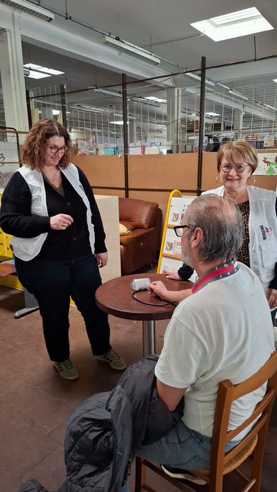 Mardi 24 février 2026, lors de la distribution alimentaire du Secours populaire du Jura, Muriel et Sandrine, infirmières Asalée, étaient présentes pour une action de sensibilisation auprès des personnes accueillies autour des risques cardiovasculaires, avec prise de tension.