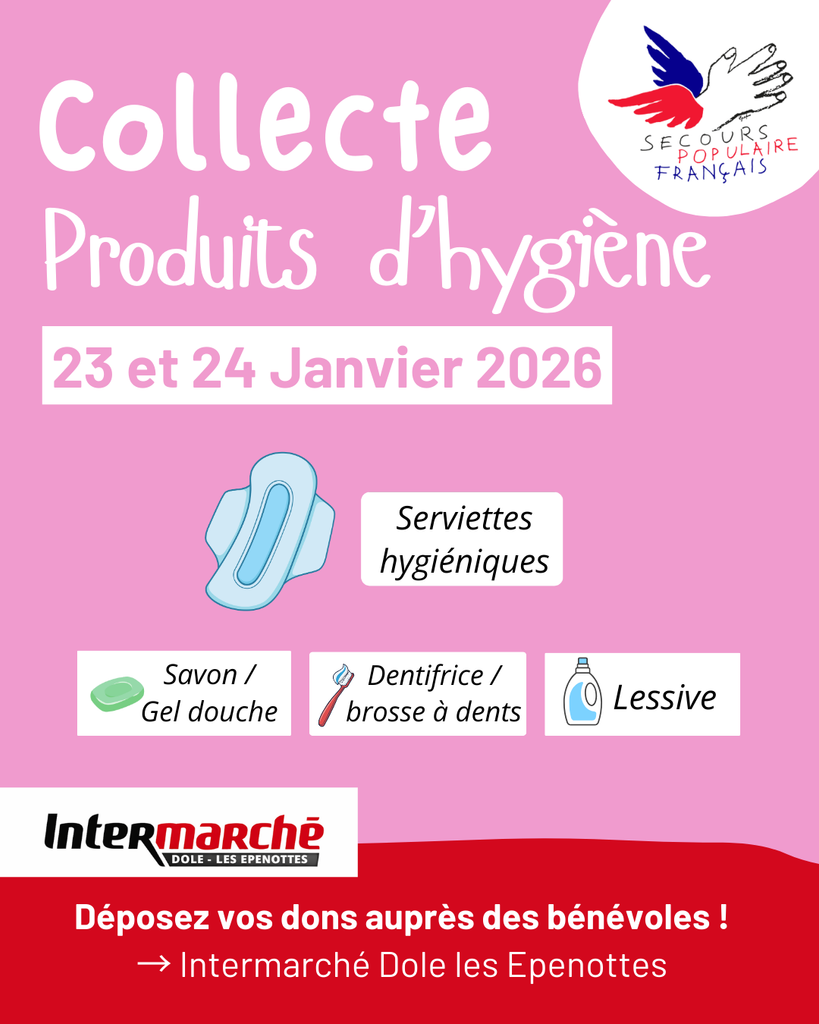 Le Secours Populaire du Jura, organise une grande collecte de produits d’hygiène le 23 et 24 janvier à Intermarché Dole Les Epenottes (9 Rue Léon Bel, Zone Commerciale Les Epenottes, Dole). Cette action vise à venir en aide aux personnes en situation de précarité en leur permettant d’accéder à des produits essentiels pour leur santé et leur bien-être quotidien.