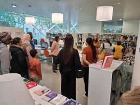La mission de Carole, Charlotte, Élodie et Jean-Luc, tous les quatre bibliothécaires à la médiathèque, fut donc de présenter tour à tour la mezzanine et ses ressources en audio et vidéo, le pôle adultes, le pôle jeunesse, le coin pour les bébés, les ordinateurs à disposition…