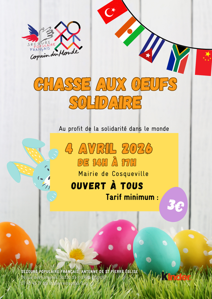 C’est le 4 avril que l’antenne de Saint-Pierre-Eglise invite les familles pour des moments festifs. Entre ateliers ludiques et recherche d’œufs en chocolat, les enfants pourront s’amuser tout en découvrant les pays dans lesquels le Secours populaire intervient.