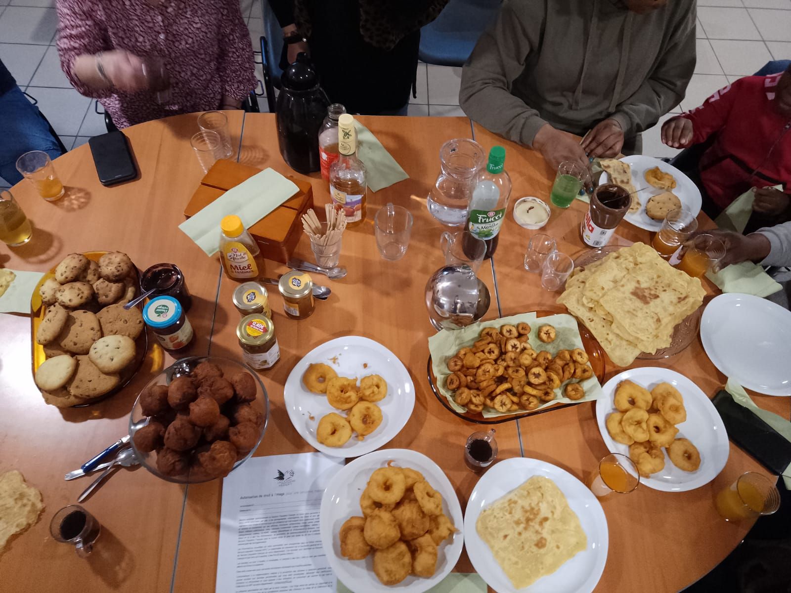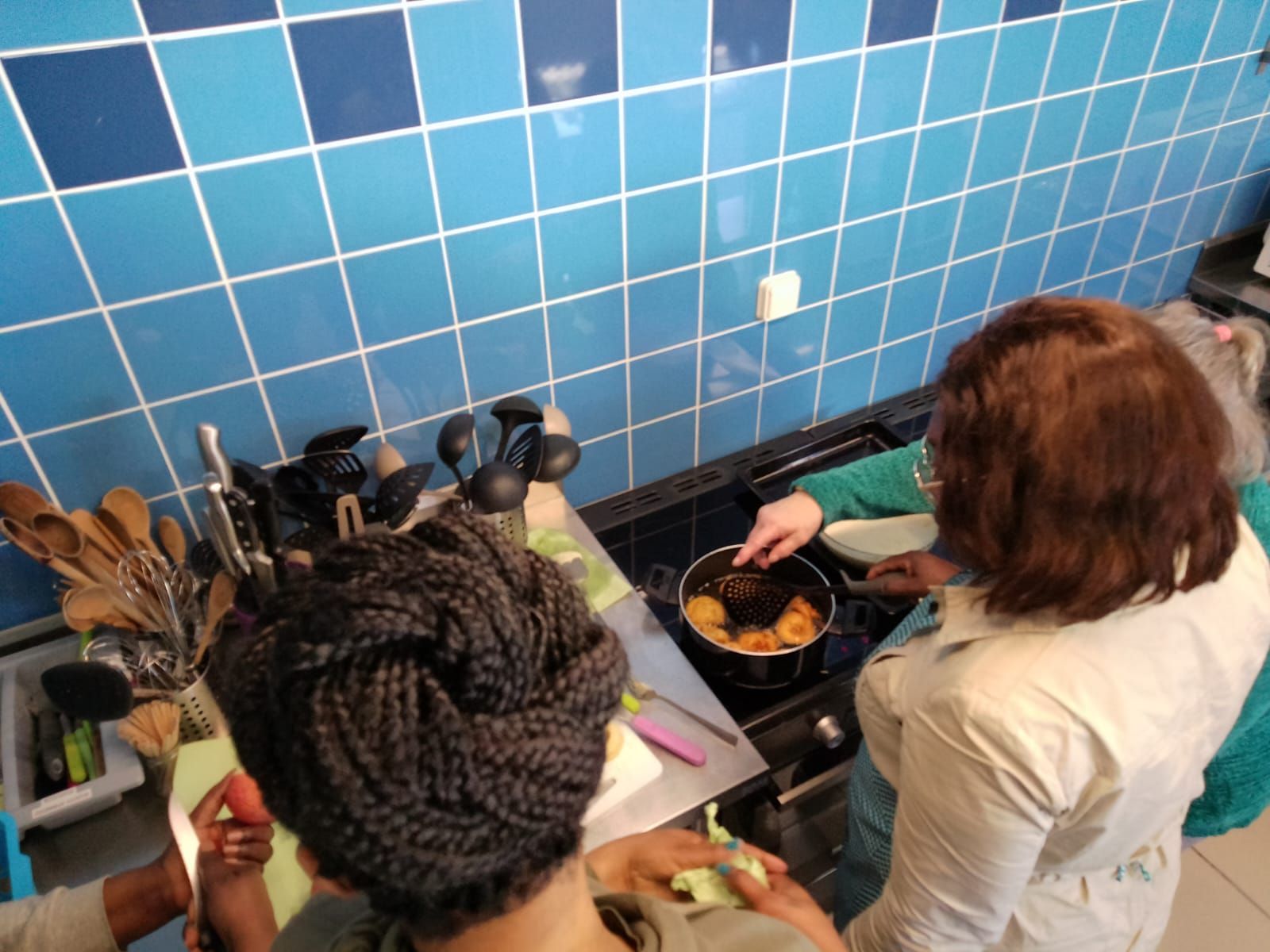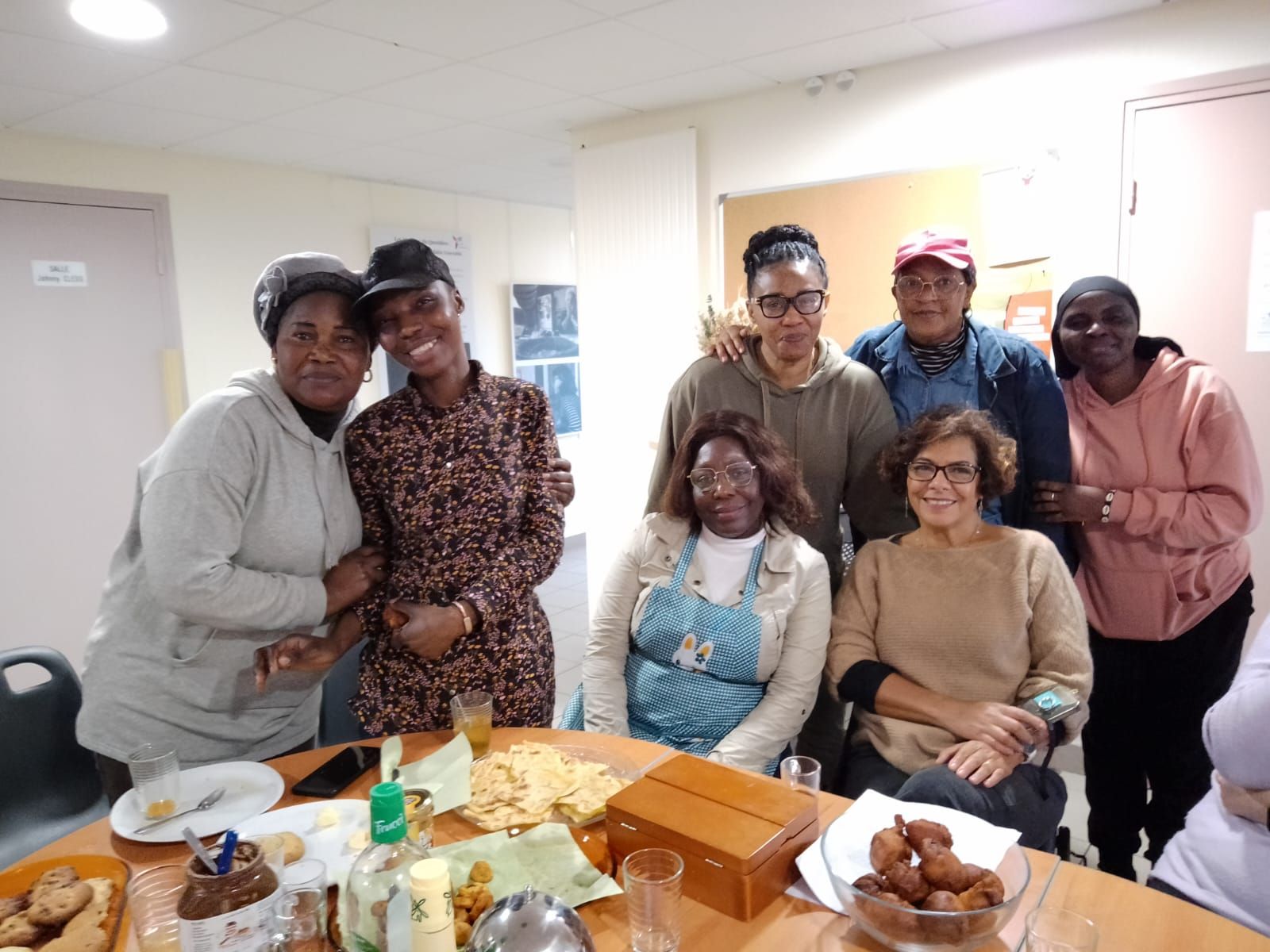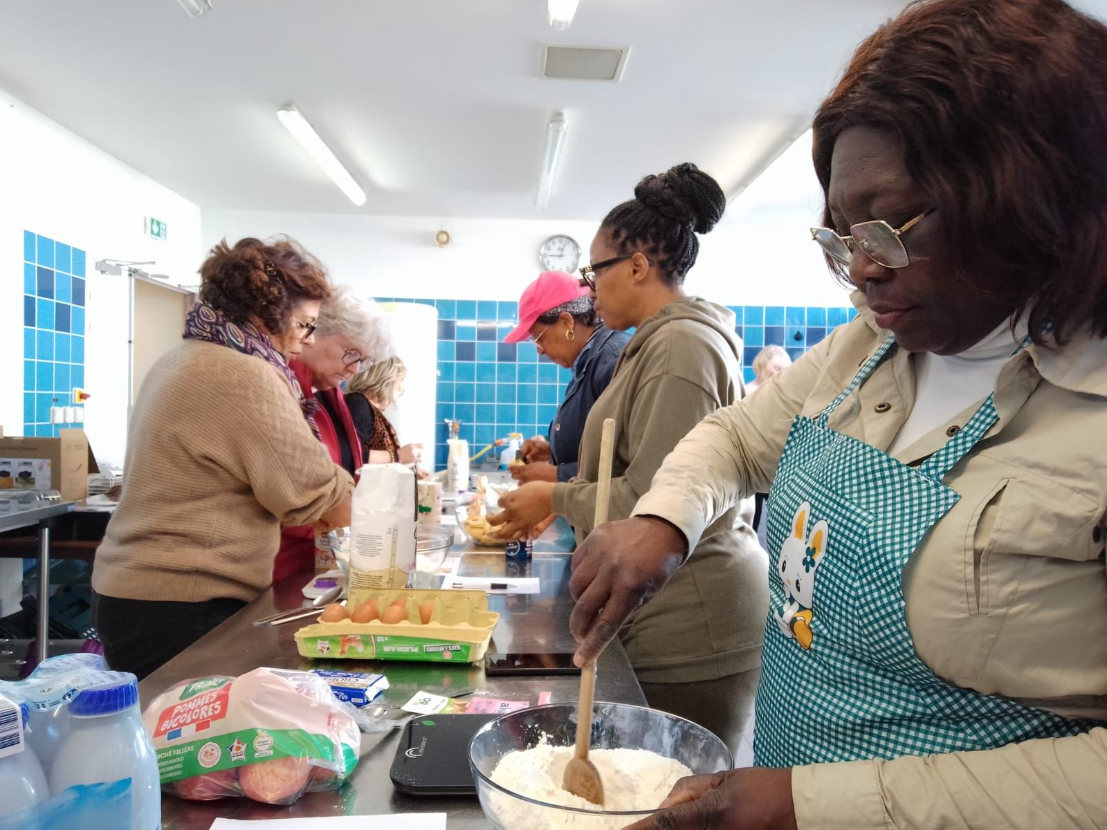 Au programme de l’après-midi : un atelier cuisine du monde suivi d’une dégustation partagée. Et comme il est toujours bon de commencer en douceurs, c’est le goûter qui est à l’honneur ce jour-là. De 14h à 16h, chacune y va de ses beignets de pommes, msemens, chips de banane plantain et cookies au chocolat.