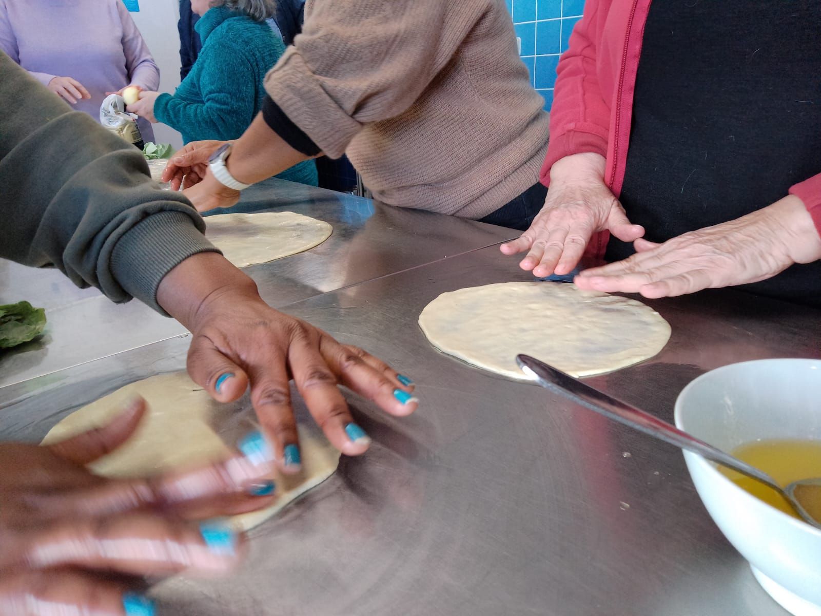 A tour de rôle les participantes transmettent et apprennent les unes des autres. La cuisine du Puzzle sent bon le sucre et le beurre, et elle est pleine de la chaleur des fours et des rencontres. A 16h, il est temps de se régaler. Salimata tartine généreusement de caramel les msemens d’Halima pour les proposer à d’autres personnes du Puzzle. L’échange se poursuit bien au-delà de l’heure prévue : c’est bon signe !