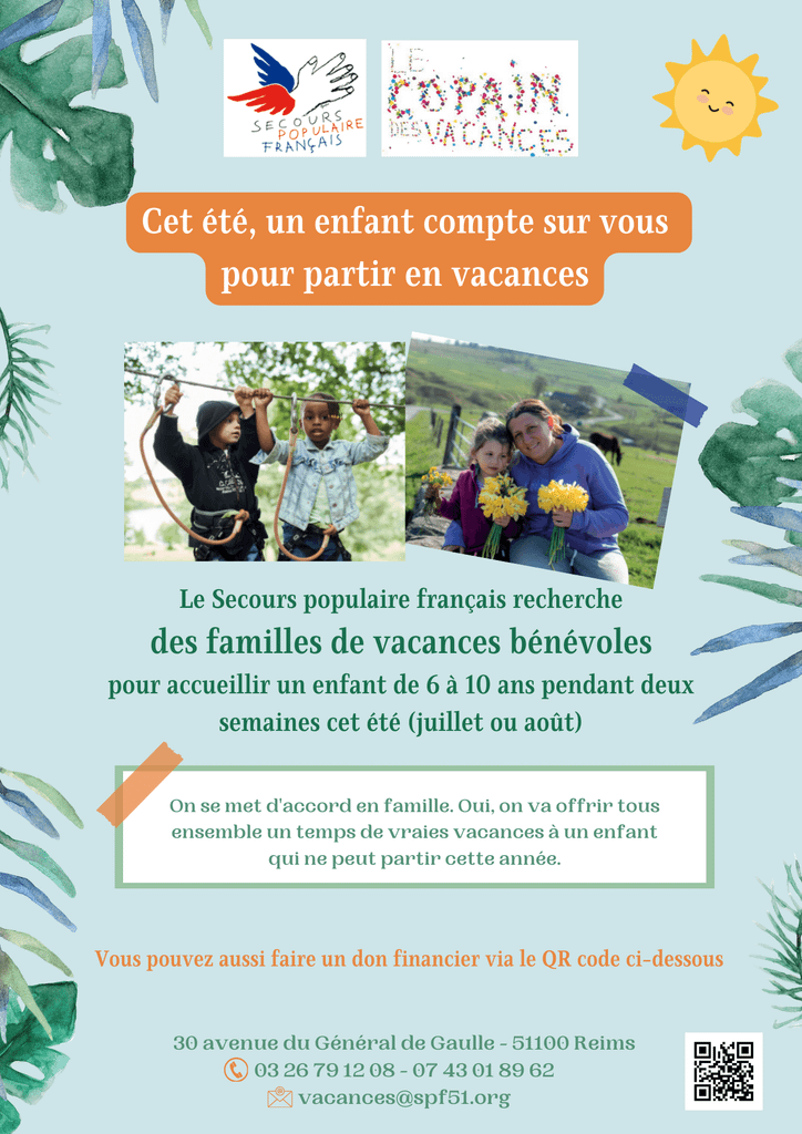 Le Secours populaire français de la Marne recherche des familles de vacances bénévoles pour accueillir un enfant de 6 à 10 ans pendant 2 semaines en juillet ou en août chez elles ou sur leur lieu de vacances.