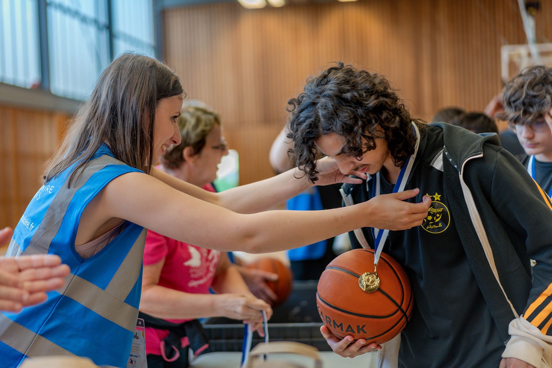 Plus de deux heures durant se déroulent les phases de poule, en un ballet savamment orchestré par les bénévoles aux manettes. Les équipes, de cinq joueurs chacune, s’affrontent en des matches de 15 minutes sur les trois terrains accolés. Que Jean-Marie, Monsieur Loyal, micro en main, n’ait pas perdu sa voix au cours de l’après-midi est un miracle. Autre miracle : que les deux journalistes de France 3, équipées de caméra et perche son, plantées au milieu du gymnase, ne se soient pas fait assommer par un ballon. Adriana, 16 ans, joueuse aguerrie au sein de l’Académie de basket du Grand Reims, quand elle ne joue pas, intègre la petite équipe d’arbitres. A l’instar de tous les joueurs, elle se donne à fond. « Aujourd’hui, je ressens le plaisir de jouer mais aussi de pouvoir donner mon temps pour que des personnes en situation de précarité puissent partager la même passion que moi. Il y a beaucoup de bonheur aujourd’hui sur le terrain ! Il y a des joueurs qui découvrent le basket alors on joue doucement – on est fair-play », témoigne-t-elle à l’issue d’un match qui a opposé son équipe à celle de la Maison de quartier d’Orgeval. Sur le sport, qui constitue la passion de sa vie, Adriana est intarissable. « Dans le sport, on a une équipe sur qui compter dans les moments difficiles. Être solidaire : c’est ça qui fait la beauté du sport. Il permet d’être en meilleure santé et se faire des amis, se donner une discipline et se fixer des objectifs à atteindre. »