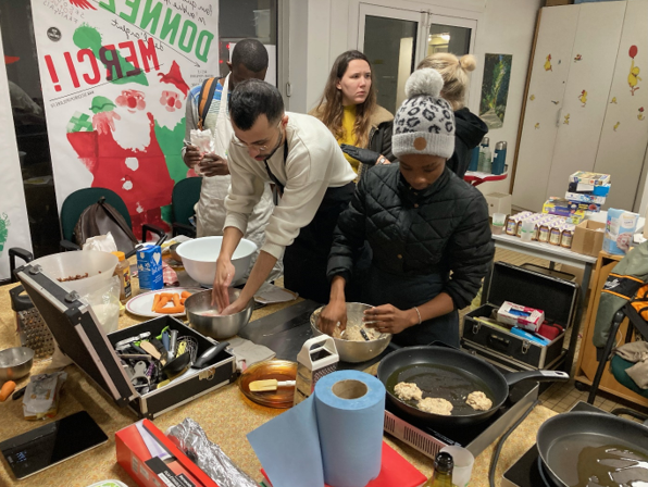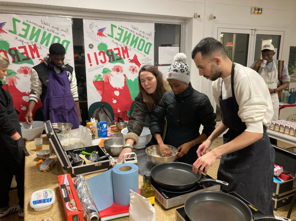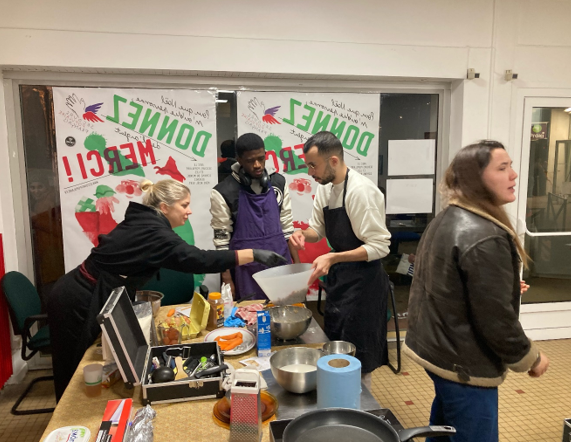 Depuis le mois de février 2024, et dans le cadre du partenariat entre le Spf54 et l’association de maraichage et d’insertion « Lortie », tous les 15 jours le mardi soir les salariés de Lortie apportent leur matériel de cuisine. Aidés par les étudiants venus chercher leur colis alimentaire, ils confectionnent des plats avec les produits frais amenés le matin même par Lortie.