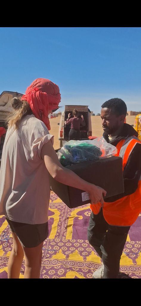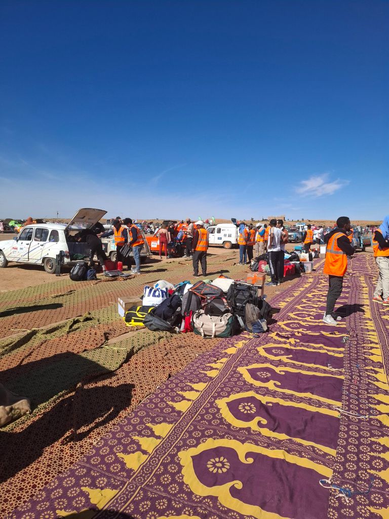 « Après une bonne partie du trajet du 4l Trophy effectuée…nous vous remettons des photos de la remise des dons effectuée ce jour à Merzouga – Maroc. »