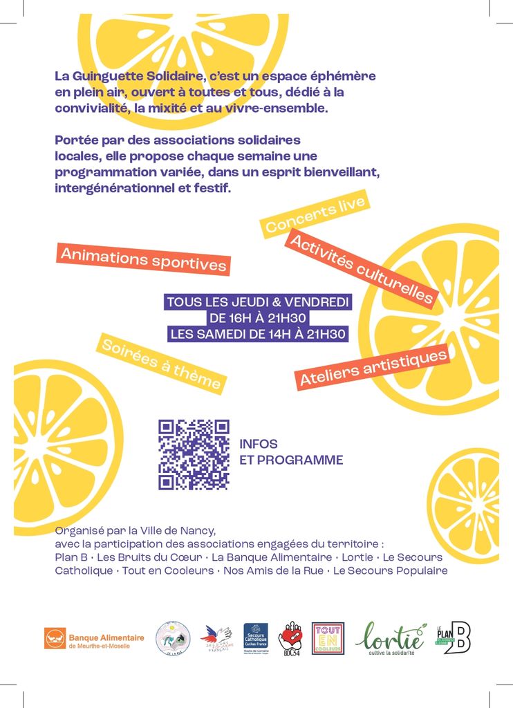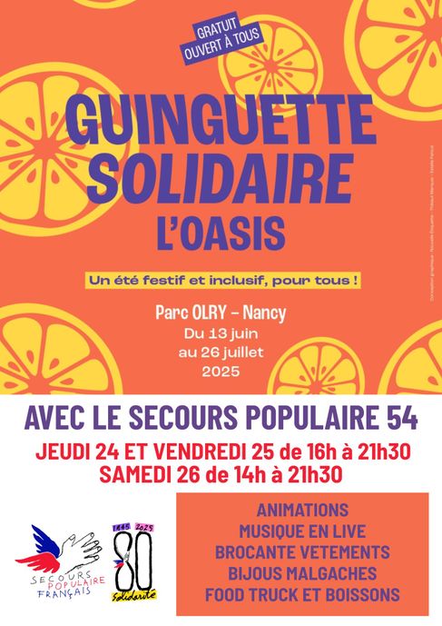 Rendez-vous cet été au parc Olry à Nancy pour la Guinguette Solidaire mise en place par le CCAS de Nancy, avec la présence en relais d’associations engagées sur le territoire. Pour le SPF 54 sera les 24/25/26 juillet, avec plein d’animations, brocante, vente de bijoux malgaches et de vêtements, de quoi se sustenter (food-truck, crêpes et boissons), de la musique en live (accordéon, guitare, country), et des surprises !