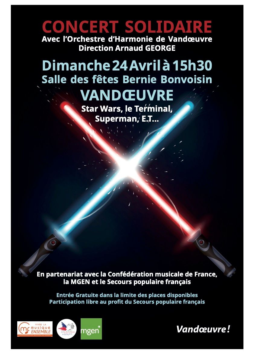 Ce dimanche 24 avril à Vandoeuvre salle Bernie Monvoisin, s’est tenu un concert solidaire au profit du Secours Populaire 54. Avec comme partenaires la confédération musicale de France et la MGEN, l’orchestre d’harmonie de Vandoeuvre sous la direction d’Arnaud Georges, a joué des musiques de film du compositeur Américain John Williams. Les nombreux spectateurs ont tous vibrés sur les thèmes de Star Wars, Superman ou autres E.T. Un fabuleux spectacle où les musiciens ont tous montré leur engagement et leur générosité dans l’effort.