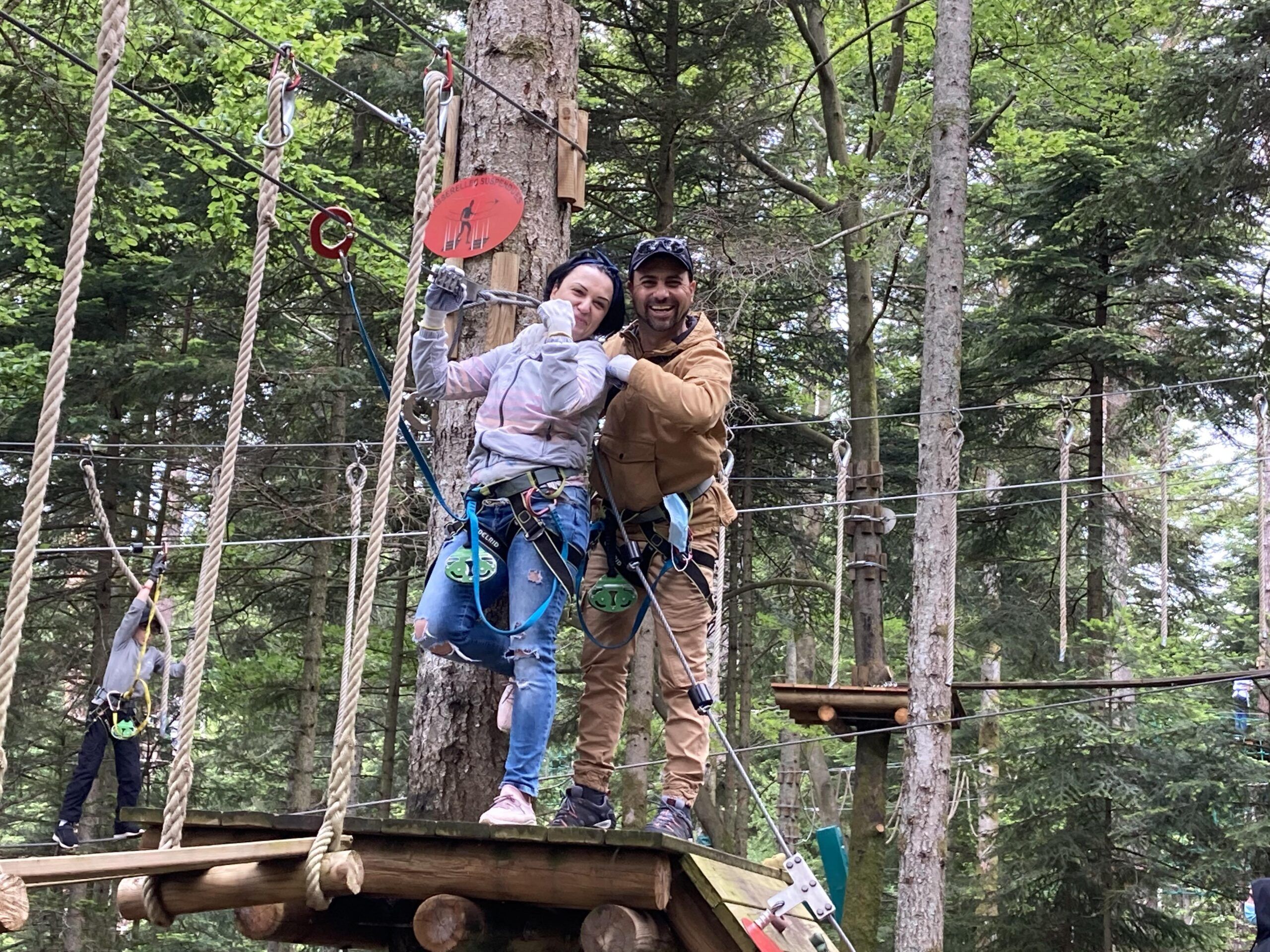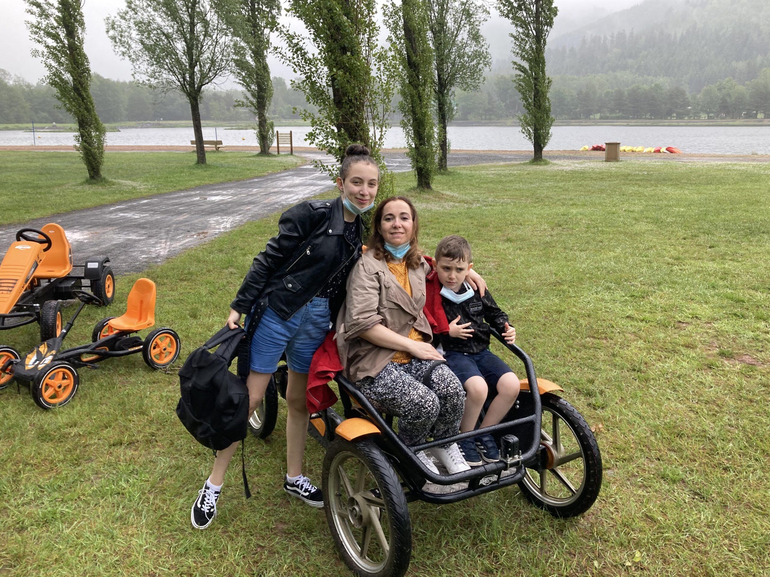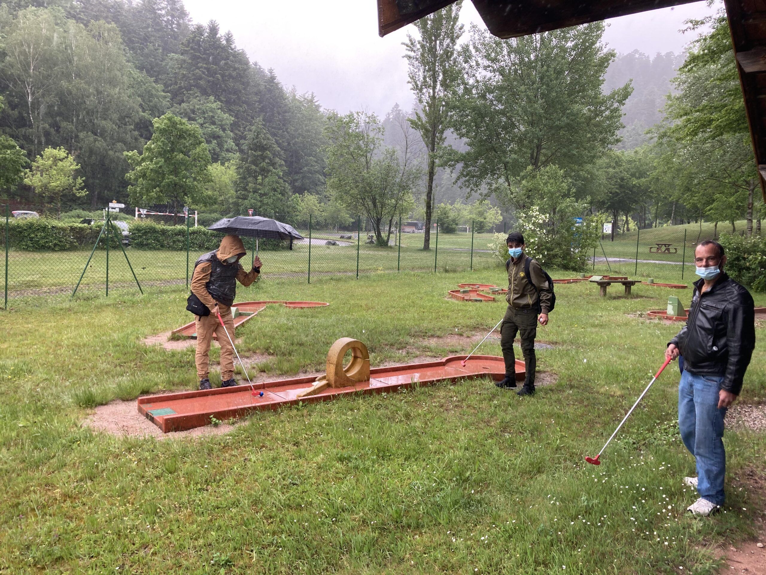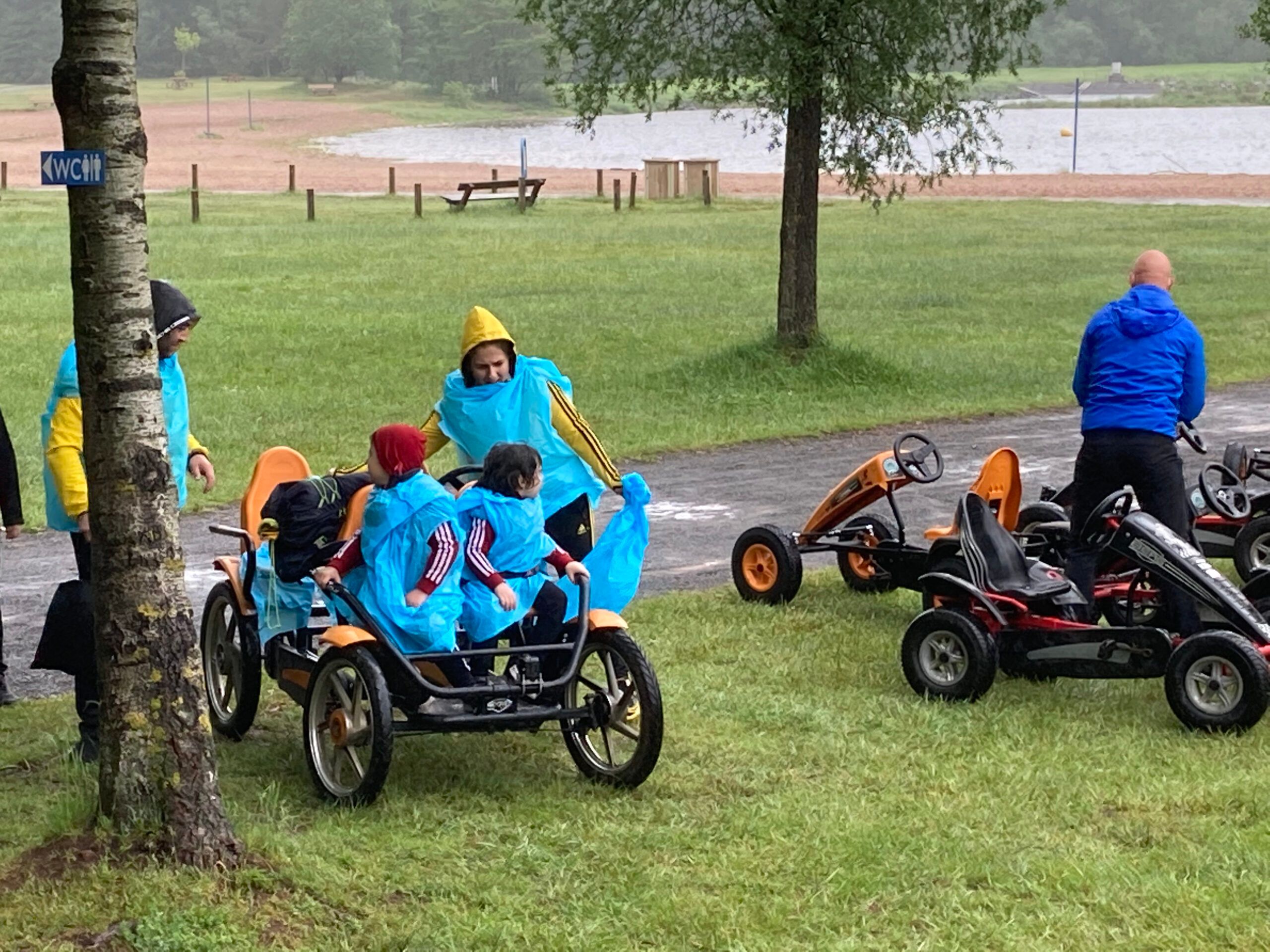 Le matin accrobranche et tyrolienne au dessus du lac et l’après-midi, sous la pluie, mini golf et kart à pédales.