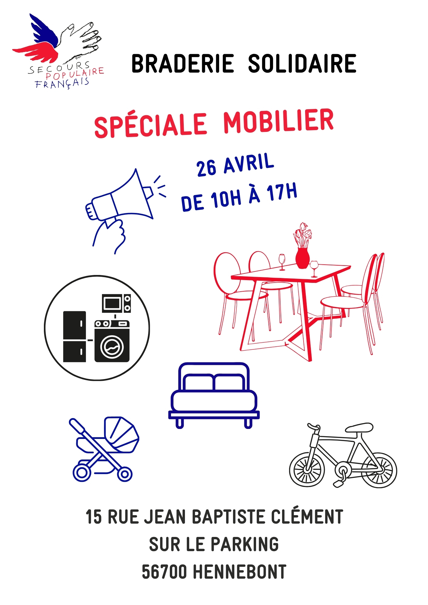 Après le succès de notre première braderie spéciale mobilier en septembre 2025, nous recommençons l’opération le 26 avril 2026. Vous y trouverez du mobilier d’occasion à petit prix : lits, tables, fauteuils, mobilier divers, électroménager… et aussi lits bébé, poussettes, siège-auto, vélo, etc. Dimanche 26 avril de 10 h à 17 h.