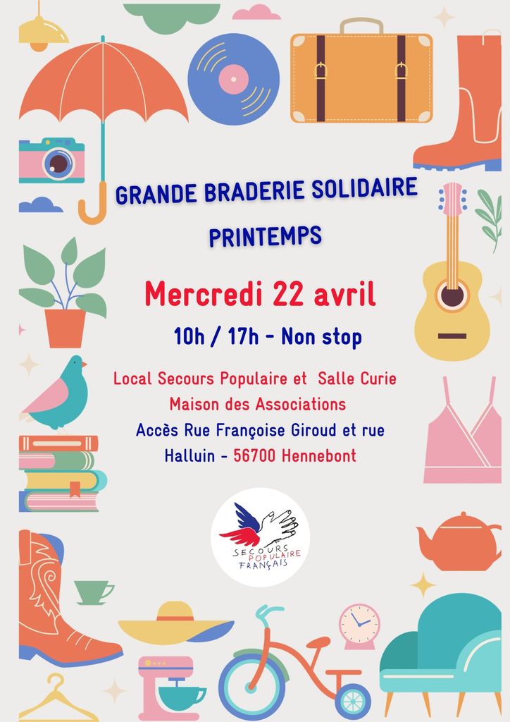Mercredi 22 avril 2026, de 10 h à 17 h, au local Secours populaire et salle Curie, Maison des associations, entrée rue Françoise-Giroud et rue Halluin, Hennebont. Gratuit. Contact : 02 97 36 40 97, communicationspfhennebont@gmail.com.