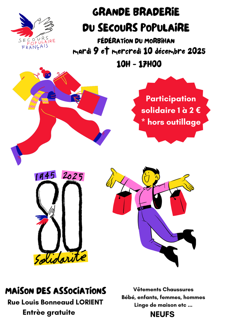 Deux fois par an, les braderies organisées par le Secours populaire français du Morbihan mobilisent des dizaines de bénévoles et font venir beaucoup de visiteurs. Véritables temps forts de solidarité, ces événements permettent de récolter des fonds essentiels pour financer nos actions en faveur des plus démunis, tout en proposant à tous des articles de qualité à petits prix : vêtements, livres, jouets, vaisselle, décoration, électroménager, etc.