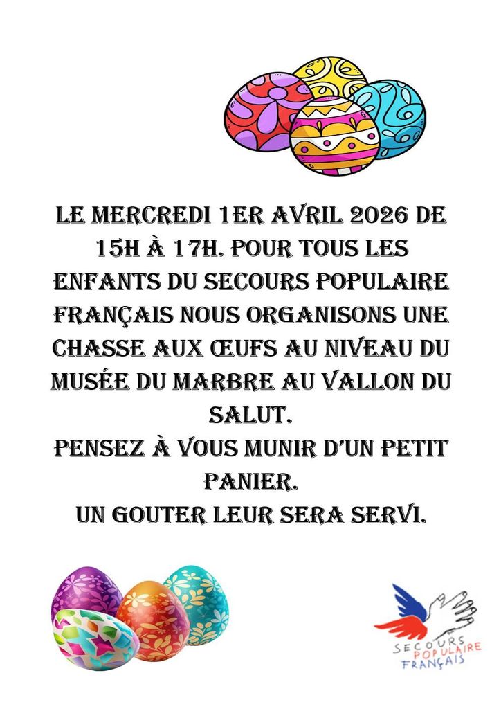 Pâques 2026, la chasse aux œufs aura lieu le Mercredi 1er Avril au Vallon du Salut.