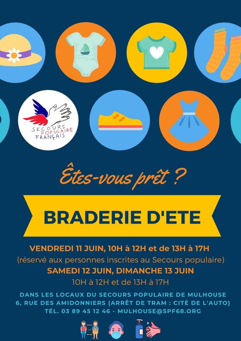 Après plus d'un an sans activités, nous sommes ravis de vous inviter à notre braderie d'été qui aura lieu les 11, 12 et 13 juin dans les locaux de notre antenne de Mulhouse. Le vendredi est réservé aux personnes aidées par le Secours populaire.
