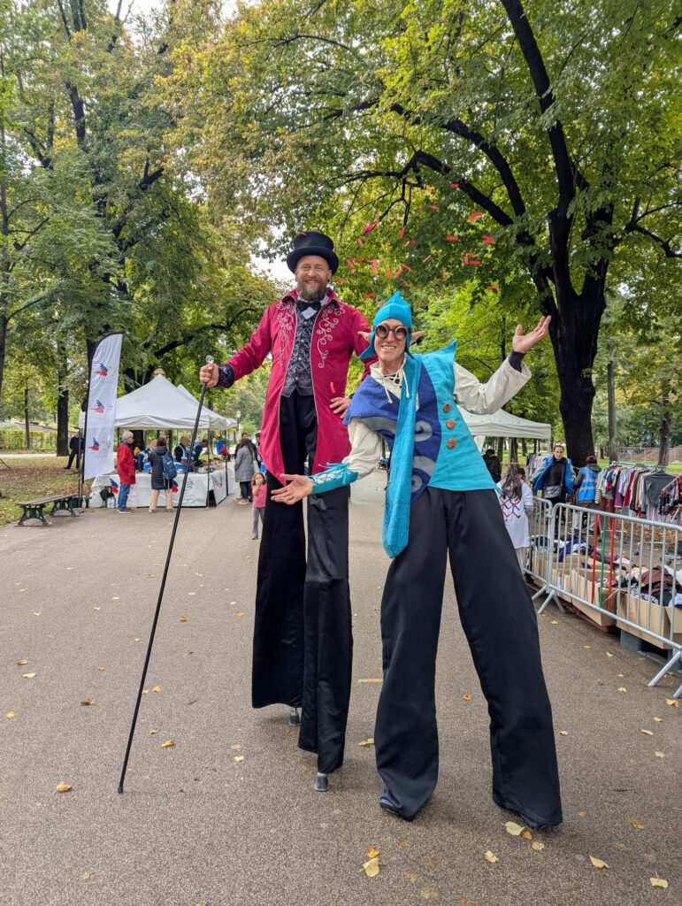 Tout au long de la journée, les échassiers de la compagnie “Enfantillages” ont déambulé parmi le public, intriguant petit·e·s et grand·e·s avec leurs costumes colorés et leur taille impressionnante.