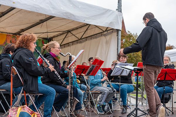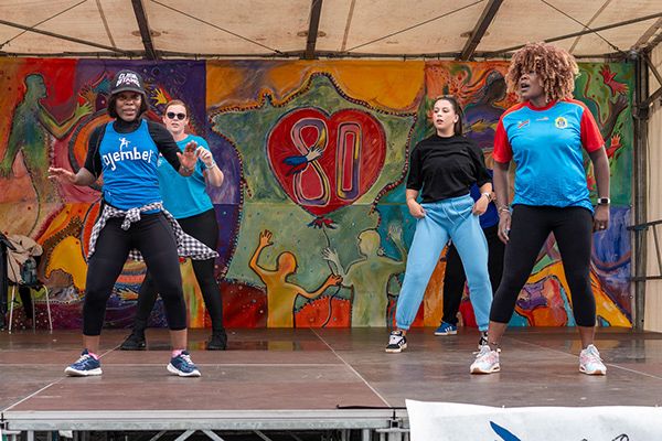 De nombreux intervenant·e·s ont contribué à la réussite de cette journée. L’École de Musique et de Danse de Wintzenheim a ouvert les festivités avec un concert, suivi du groupe de danses africaines Djembel Alsace . En fin d’après-midi, c’est Bakary, alias Stone le Pasha, qui a clôturé cette belle journée en musique, dans une ambiance festive et bienveillante. Les spectateur·ice·s ont également pu admirer les toiles de l’artiste Valoo, peintes préalablement pour cette journée avec les personnes accompagnées des Espaces de Solidarité de Mulhouse et de Colmar. Les passant·e·s ont d’ailleurs pu contribuer à la réalisation d’une nouvelle toile, toujours en hommage aux 80 ans de l’association.