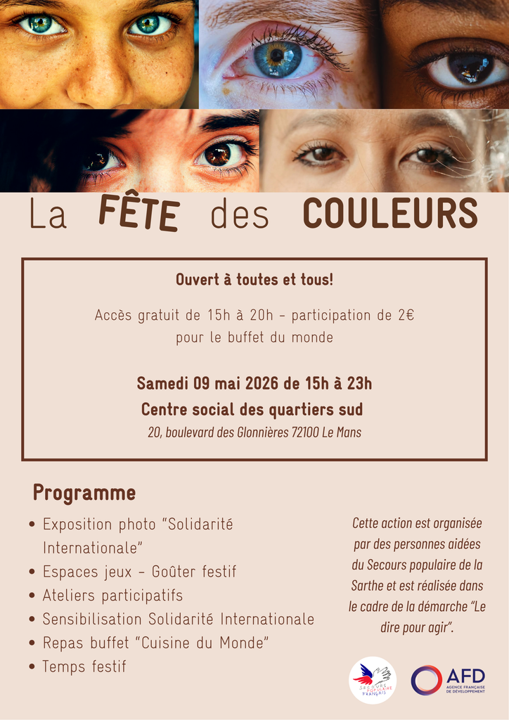Samedi 9 mai, les personnes aidées et les bénévoles du Secours populaire proposent une fête des couleurs ouverte à tous. De 15h à 23h, le Centre social "Trait d'unions" (Quartiers sud) accueillera de nombreux stands valorisant la richesse culturelle des personnes aidées et des bénévoles par le biais de la cuisine, de la danse, de la coiffure, de la musique...