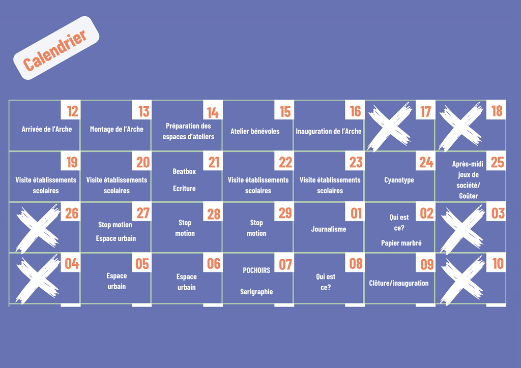 La présence de cette arche ouvre de nombreuses opportunités de rencontre, de partage et de création. Un programme a été imaginé à destination du plus grand nombre : grand public, personnes aidées par le Secours populaire, jeunes, enfants et scolaires…