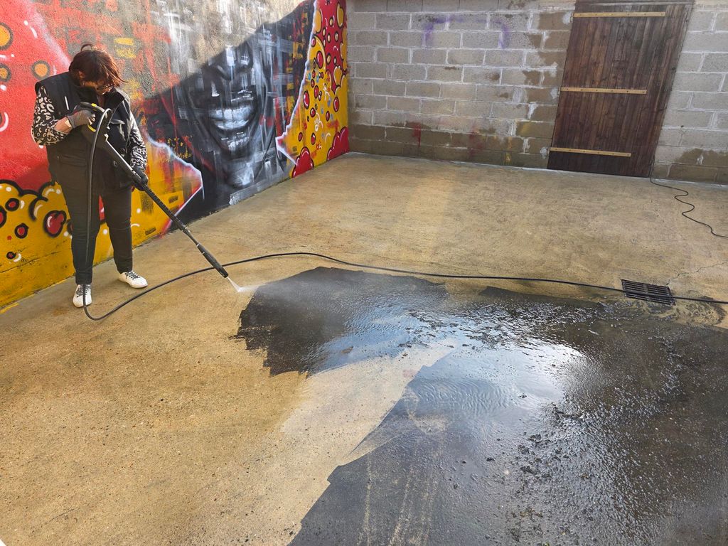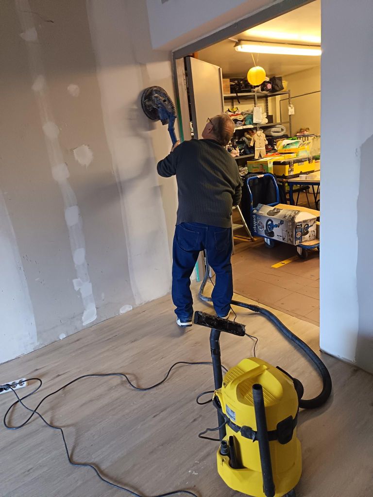 Afin de mieux utiliser ces espaces, des artisans ont été missionnés pour installer fenêtre, murs et plafond sur la partie entrepôt, tout en refaisant l’électricité. L’un des artisans a même fourni et posé gratuitement le nouveau sol de la pièce. Sur cette base, plusieurs bénévoles ont réalisé la peinture, et posé les plinthes. Pour compléter ce travail, deux bénévoles ont nettoyé le sol de la cour, pour l’éclaircir.