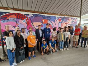En partenariat avec le CCAS , la MJC ainsi que les associations logées à cet endroit, les jeunes ont oeuvré 4 samedis pour réaliser cette superbe fresque: expérience enrichissante et affirmation d’une volonté de fraternité et de solidarité.