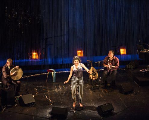 Norah est une comédienne d’origine tunisienne qui interprète ce soir des extraits du poème AL ATLAL, Les Ruines, immortalisé autrefois par la célèbre chanteuse égyptienne Oum Kalsoum et chanté par sa mère lorsqu’elle était enfant. Pour Norah c’est l’occasion de laisser remonter des souvenirs forts de son passé dans la banlieue parisienne: des parfums d’épices, des odeurs de cuisine orientale, les gestes de sa mère préparant le café sur le kanoun, le grand saule du jardin, des chants qui disent l’amour et la souffrance de l’exil.