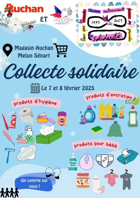 Les bénévoles du Secours populaire de Melun collecteront des produits d’hygiène, d’entretien et des produits pour bébés le vendredi 7 et samedi 8 février de 9h à 18h au magasin Auchan Melun Sénart à Cesson.