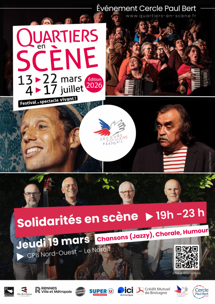 Dans le cadre du festival Quartiers en Scène, cette soirée vibrante met en scène des artistes bénévoles comme Caju (Jazz et Chanson), La tête à l’est (musiques d’Europe de l’Est), Gabriel Saglio et son trio (chanson poétique jazzy) et l’humoriste Albert Meslay. Parrainée par Ici Armorique et Isabelle Aubret (vidéo de présentation ci-dessous), elle offre une ambiance intergénérationnelle avec buvette et petite restauration.