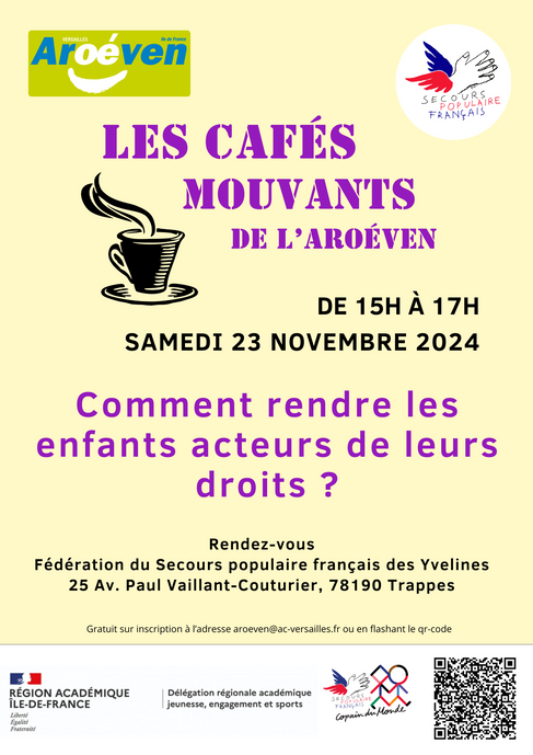 Le 20 novembre est la Journée Internationale des droits de l’Enfant. À cette occasion, l’Aroéven et le Secours populaire français sont heureux de vous convier au Café Mouvant sur les Droits de l’Enfant, qui se tiendra le samedi 23 novembre 2024. L’Aroéven, une association d’éducation populaire, milite pour une éducation permanente et inclusive. Le Secours populaire français, héritier de la Résistance, œuvre pour un monde plus équitable et solidaire.