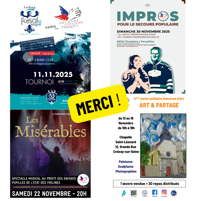 La Compagnie Gavroche a réuni 495 spectateurs autour de l’œuvre de Victor Hugo à La Merise. Entre billets et crêpes solidaires, 7 456,50 € ont été récoltés au profit de l’antenne « Enfants Pupilles de l’État » du Secours populaire des Yvelines. Grâce à cette générosité, 177 enfants vivront des instants de culture et de dignité.