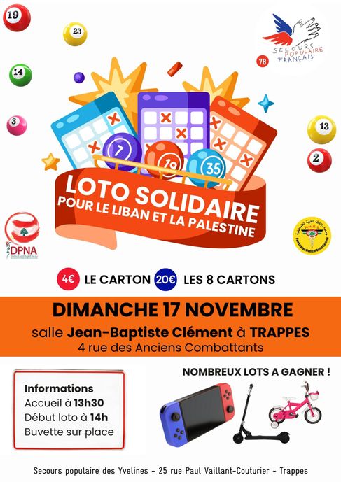 Rejoignez-nous pour une journée de solidarité et de divertissement lors du LOTO SOLIDAIRE organisé par le Secours populaire des Yvelines ! Rendez-vous le dimanche 17 novembre à la Salle Jean-Baptiste Clément de Trappes.