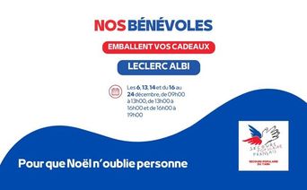 A l’approche des fáșżtes, nos bĂ©nĂ©voles emballent vos cadeaux si vous le souhaitez. Retrouvez-les dans le magasin Leclerc des Portes du Tarn Ă Albi, les 6, 13, 14 dĂ©cembre et du 16 au 24 dĂ©cembre, de 09h00 Ă 13h00, de 13h00 Ă 16h00 et de 16h00 Ă 19h00.