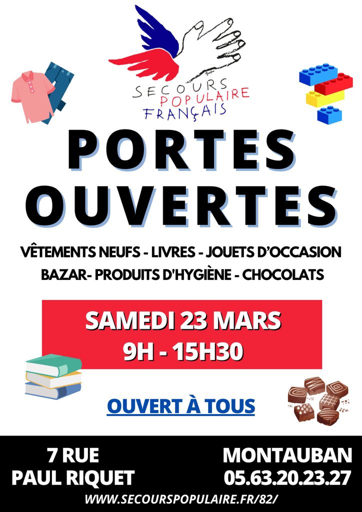 Le Secours populaire de Montauban vous invite à ses prochaines portes ouvertes qui auront lieu au 7 rue Paul Riquet à Montauban le Samedi 23 Mars 2024 de 9h à 15h30.