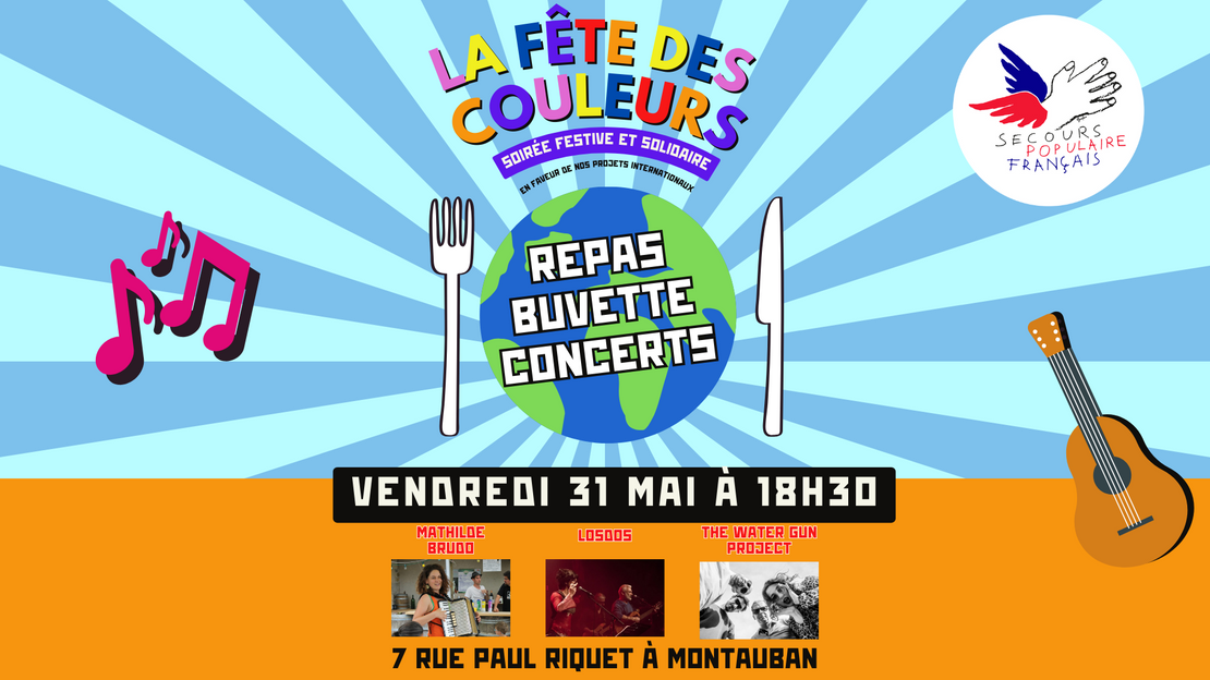 Le Secours Populaire du Tarn-et-Garonne vous convie à la Fête des couleurs, une soirée de musique, de partage et de solidarité ! Rendez-vous le vendredi 31 Mai dès 18h30 dans nos locaux au 7 rue Paul Riquet à Montauban (Zone Nord) pour une soirée pleine de couleurs et de bonne humeur !