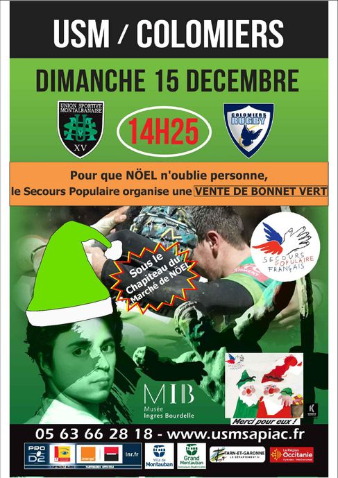 Dimanche 15 décembre à partir de 12h00 heures, à l’occasion de la rencontre de PRO D2 de rugby qui opposera l’USM Montauban à l’USM Colomiers, le Secours sera accueilli au village de Noël de l’équipe montalbanaise afin d’organiser une vente de bonnets verts.